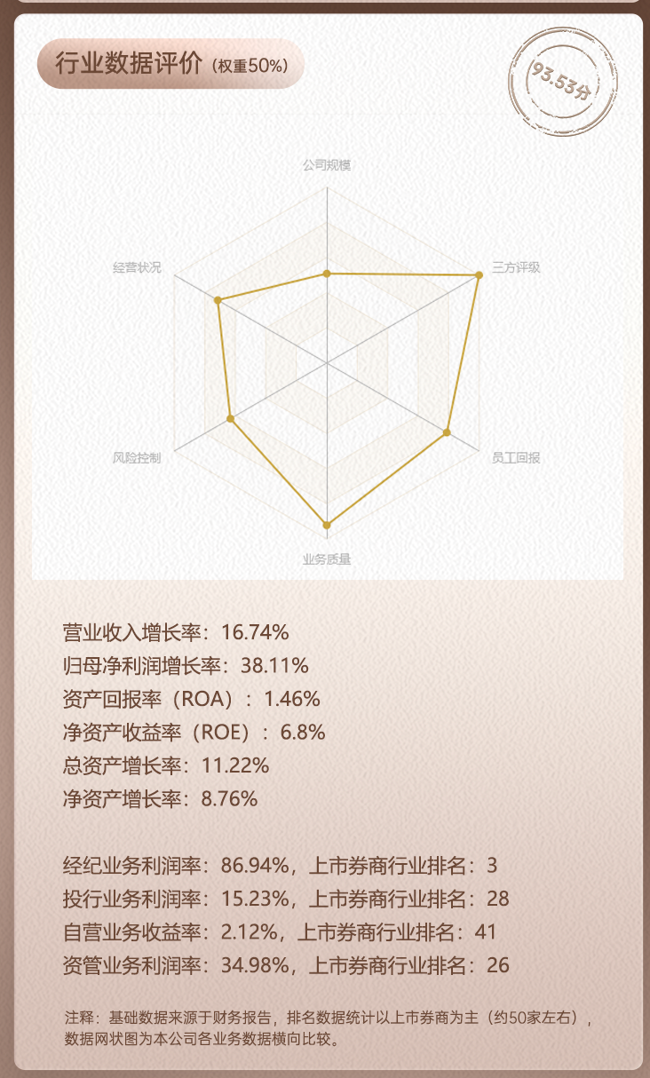 六大板块中,公司规模、业务质量、三方评级在50家上市券商中分别排名第5位、第8位、第1位,规模与业务优势抬升整体评分水平。