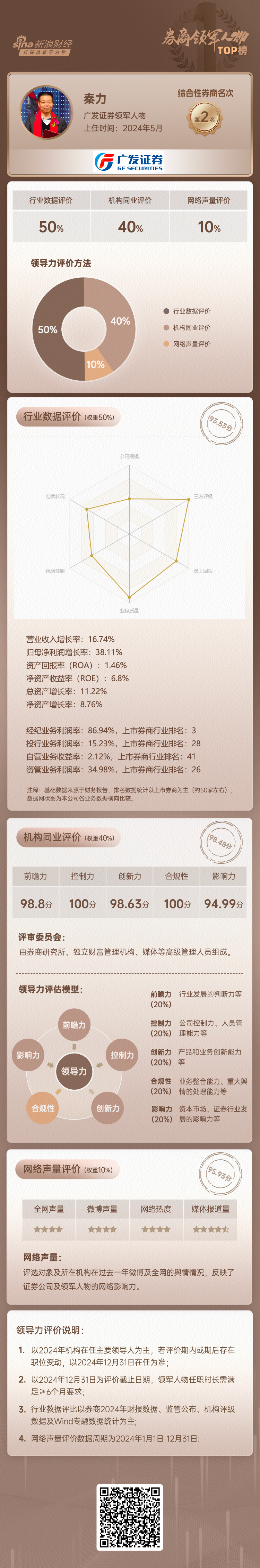 按照上述方法,广发证券秦力行业数据评价总得分为93.53分,在50家上市券商中排名第3名,在8家参评综合性上市券商中排名第2名。