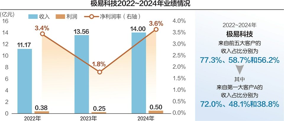 招股书(申报稿)显示,2022~2024年,极易科技来自前五大客户的收入占比分别为77.3%、58.7%和56.2%,其中来自第一大客户A的收入占比分别高达72.0%、48.1%和38.8%。因此,极易科技的经营对其第一大客户A存在一定的依赖性。