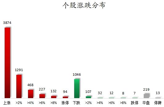 个股涨跌情况,截至收盘,沪深两市合计3874只个股上涨,1046只个股下跌,平盘个股219只,停牌的个股13只。不含当日上市新股,共有94只个股涨停,7只个股跌停。