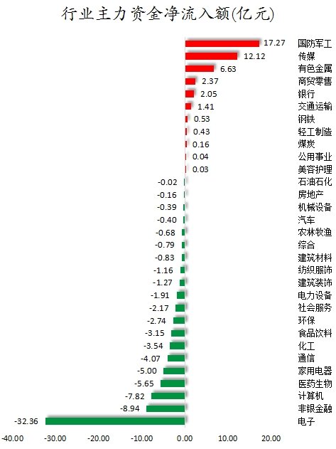 从行业来看,申万所属的31个一级行业,今日有11个行业主力资金呈现净流入,其中,国防军工行业主力资金净流入最多,净流入金额为17.27亿元;行业主力资金净流入居前的还有传媒、有色金属、商贸零售等,净流入金额分别为12.12亿元、6.63亿元、2.37亿元。20个行业主力资金呈现净流出,其中,电子行业主力资金净流出最多,净流出金额为32.36亿元;行业主力资金净流出靠前的还有非银金融、计算机、医药生物、家用电器、通信等,净流出金额分别为8.94亿元、7.82亿元、5.65亿元、5亿元、4.07亿元。