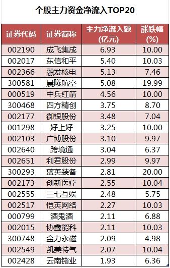 个股来看,今日有2172只个股获主力资金净流入,其中,63股获主力资金净流入超1亿元。成飞集成主力资金净流入最多,净流入金额为6.93亿元;主力资金净流入居前的个股还有东信和平(002017)、融发核电、晨曦航空(300581)、中兵红箭(000519)、四方精创(300468)等,净流入金额分别为5.4亿元、5.13亿元、5.08亿元、4.56亿元、3.75亿元。