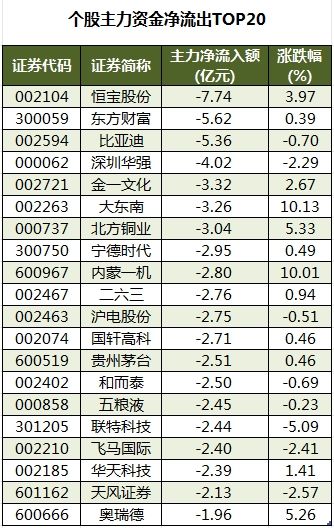 今日有2962只个股被主力资金净卖出,其中,56股被主力资金净卖出超1亿元。主力资金净流出最多的个股是恒宝股份(002104),净流出金额为7.74亿元;主力资金净流出居前的个股还有东方财富(300059)、比亚迪(002594)、深圳华强(000062)、金一文化(002721)、大东南等,净流出金额分别为5.62亿元、5.36亿元、4.02亿元、3.32亿元、3.26亿元。