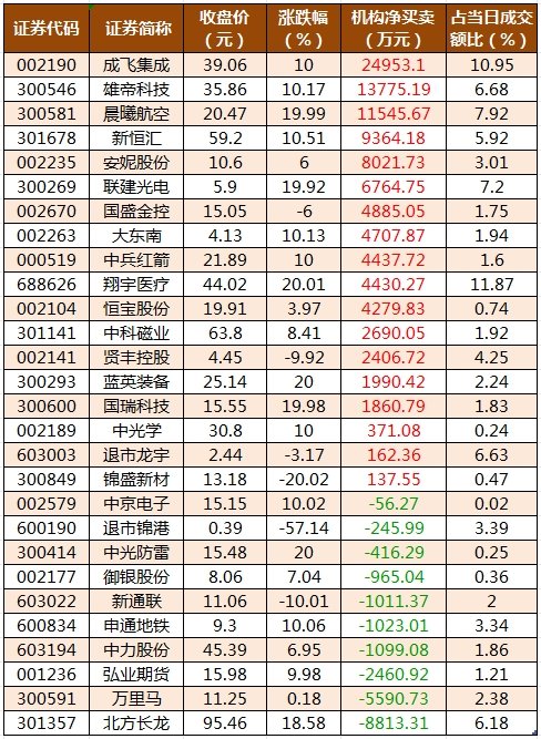 盘后龙虎榜数据显示,今日机构席位资金合计净买入约8.51亿元。其中,净买入的个股18只,净卖出的个股10只。机构净买入最多的股票是成飞集成,净买入金额约2.5亿元;机构净买入居前的还有雄帝科技(300546)、晨曦航空、新恒汇、安妮股份(002235)、联建光电(300269)等股。机构净卖出最多的股票是北方长龙,净卖出金额约8813.31万元;机构净卖出居前的还有万里马(300591)、弘业期货等股。