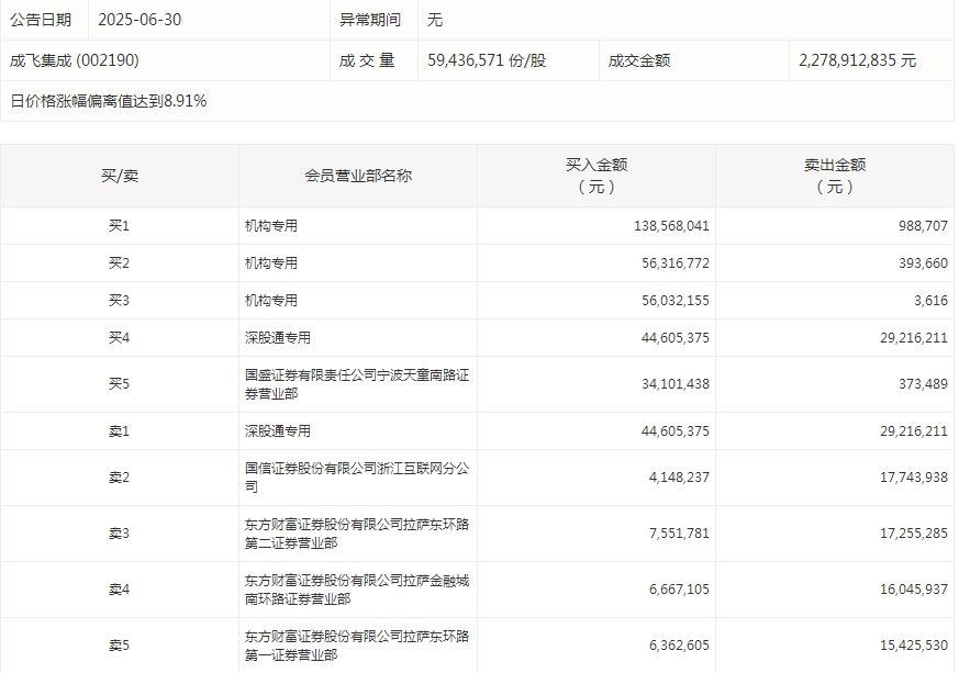 成飞集成今天涨停。盘后数据显示,3家机构出现在龙虎榜单上,合计净买入约2.5亿元;国盛证券有限责任公司宁波天童南路证券营业部买入3410.14万元,同时卖出37.35万元;国信证券(002736)股份有限公司浙江互联网分公司买入414.82万元,同时卖出1774.39万元。